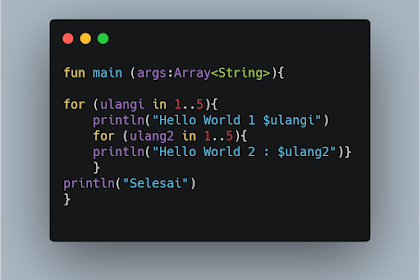 Bahasa Pemrograman Kotlin Nested Loop pada Kotlin Nested Loop merupakan perulangan didalam perulangan. Source code Perulangan tersebut akan menghasilkan output Hello World1 yang a... By para Thursday, November 21, 2019 Add Comment Edit